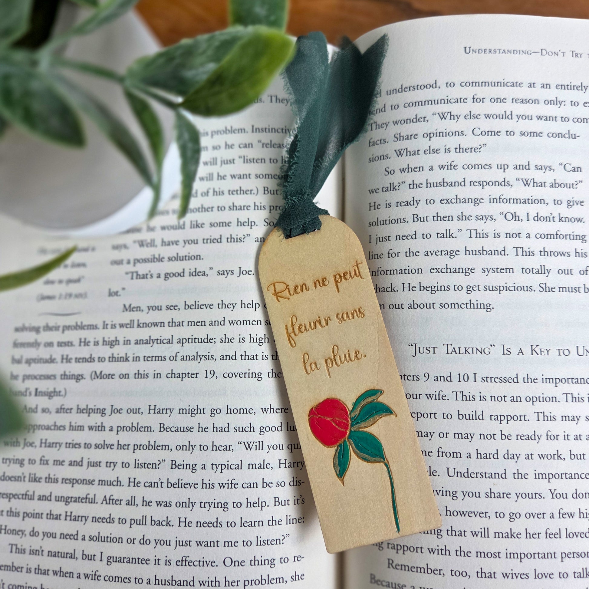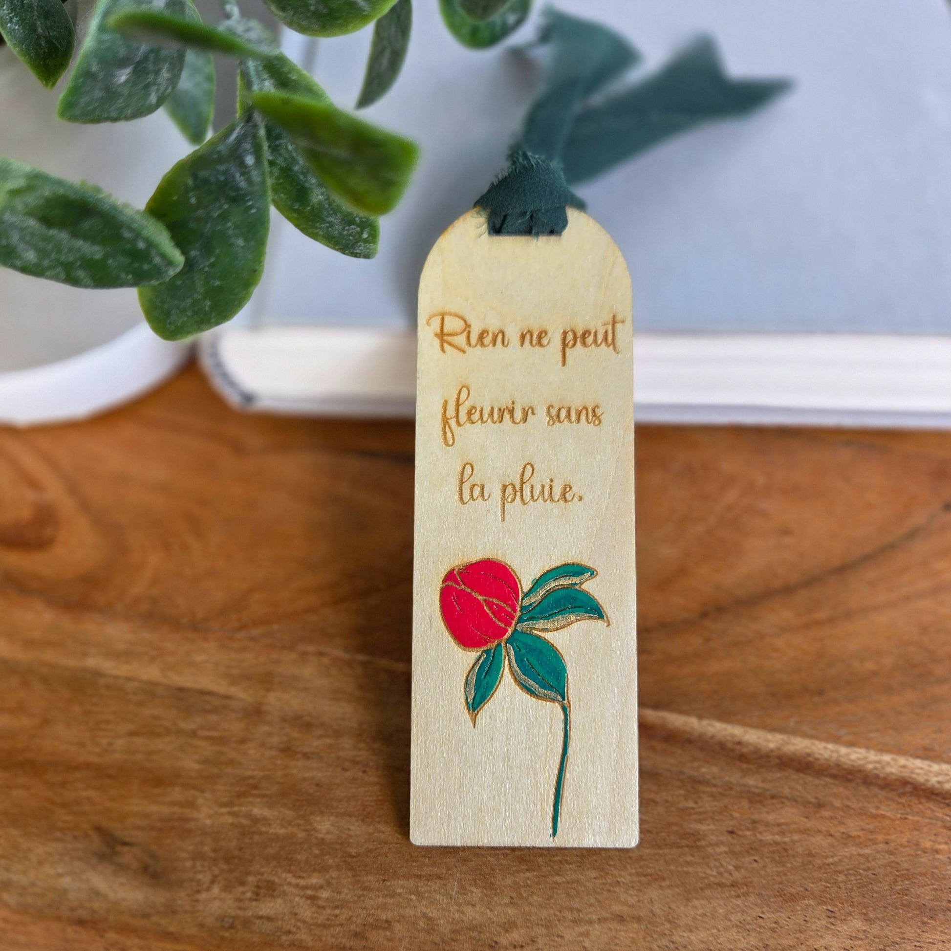 Marque-page en bois, gravé au laser et peinturer à la main. Vernis pour durabilité.