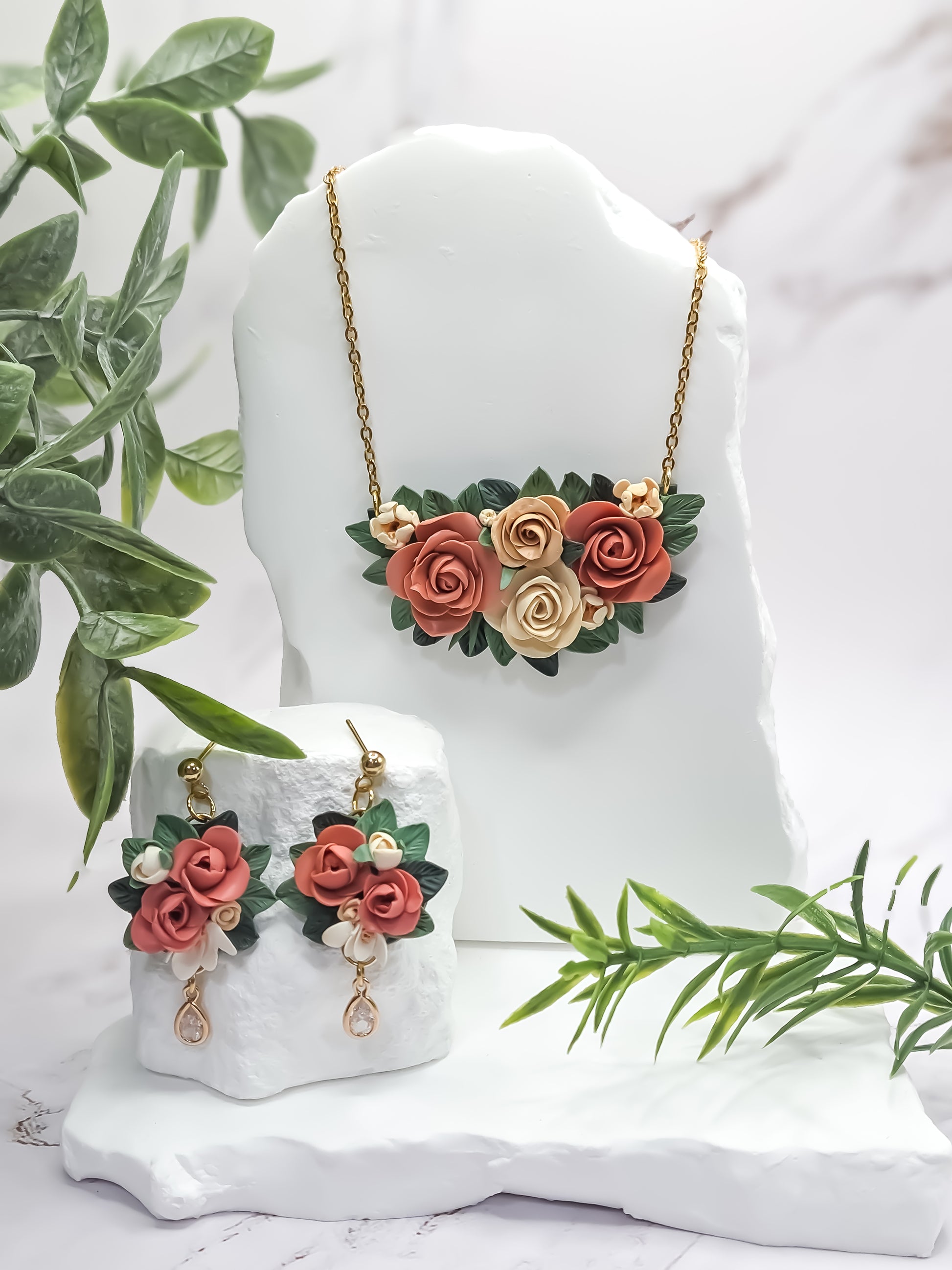 Fleurs et feuillages sculptées à la main en pâte polymère.